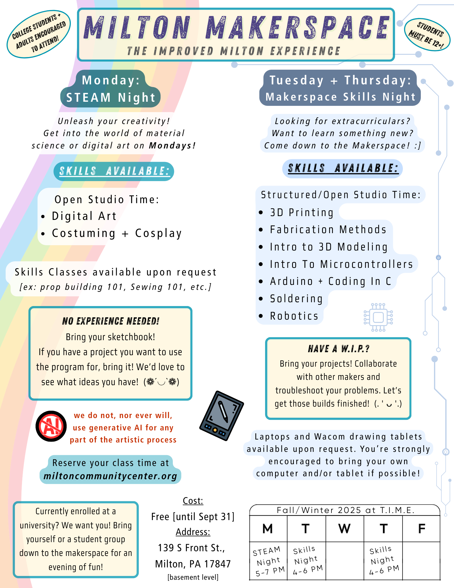 Providing hands-on STEAM cirriculum to rural middle, high school, and college students through a mix of after school programs and special events. Currently developing, leading, and co-running multiple long-duration programs that cover many disciplines. Subjects include but are not limited to: environmental science, robotics, coding, novel methods of fabrication, earth science, digital arts, and more.
